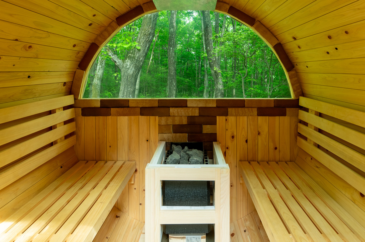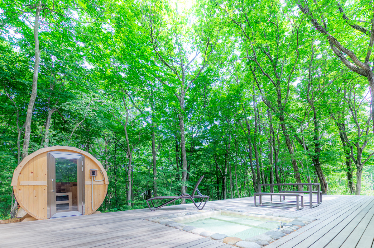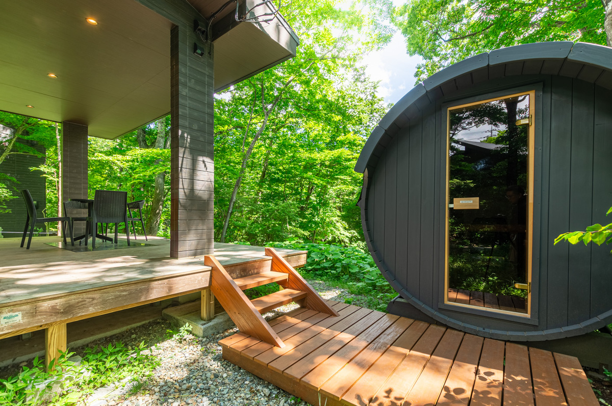 庭に設けられたサウナは、森の緑に包まれながらじっくりと身体を温めることで極上のリラックスを味わえます。